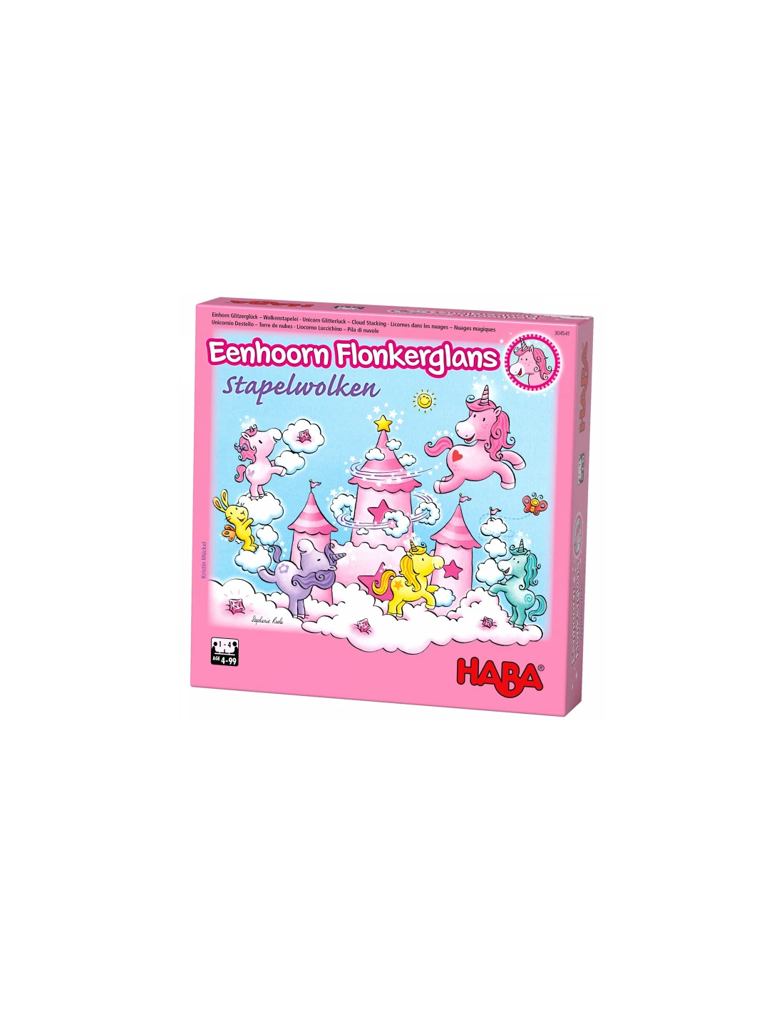 Contents: 4 unicorns: Glitterluck (hot pink), Stardust (yellow), Marvel Flower (purple), and Magic Swirl (turquoise), 1 baby unicorn Rosalie (pink), 1 cloud castle, 5 large white clouds and 5 smaller blue clouds, 1 die, 1 cloud game board, 16 double sided cloud tiles, 10 cloud crystals and instructions booklet
