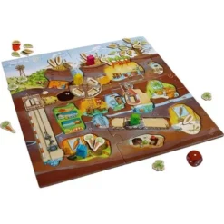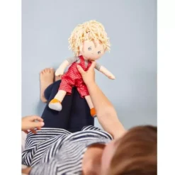 Een zachte lappenpop Annelie in een rood gestippeld jurkje van het Duitse merk Haba voor de allerkleinste poppenmoeders. Haar geborduurd gezichtje met sproeten glimlacht vrolijk onder een bos blond chenille haar.
